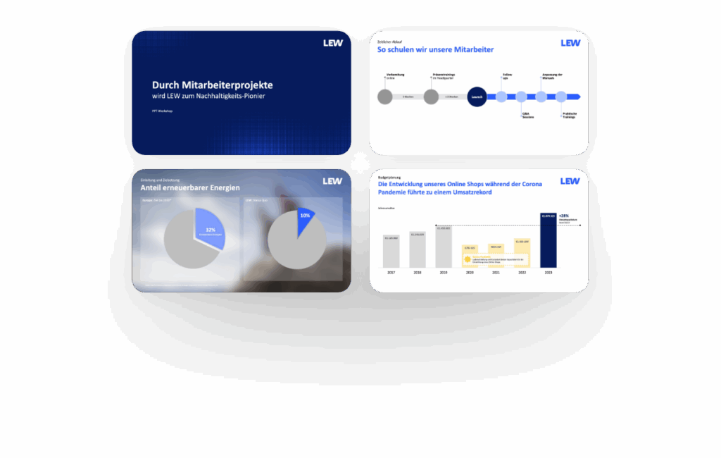 Die Workshop-Präsentation besteht aus Folien aus dem Präsentation-Alltag der Teilnehmenden und ist bei Inhouse-Trainings in eurem Corporate Design angelegt. Wir können gemeinsam den Inhalt der Präsentation im Vorhinein konzipieren und auf euren Bedarf auslegen.